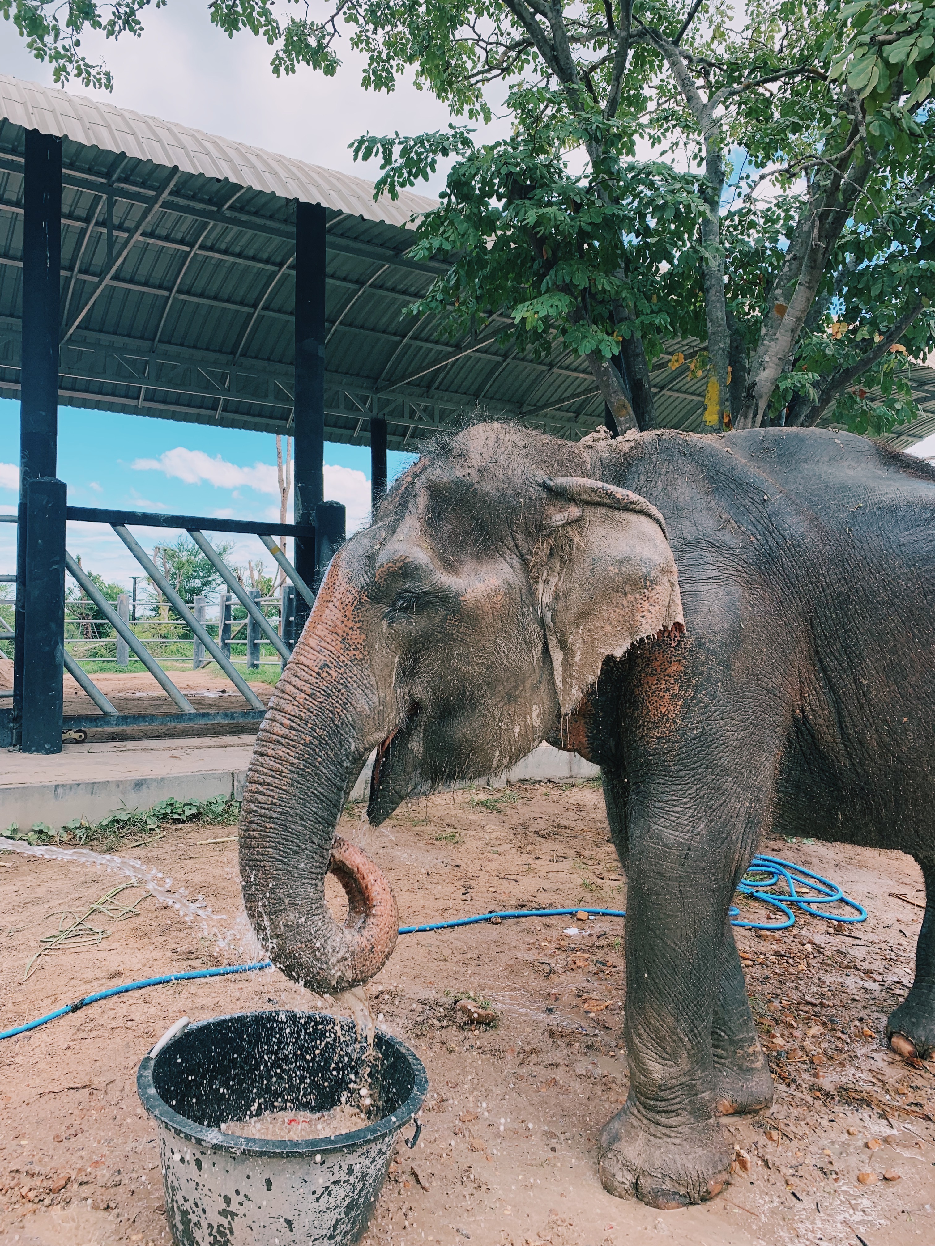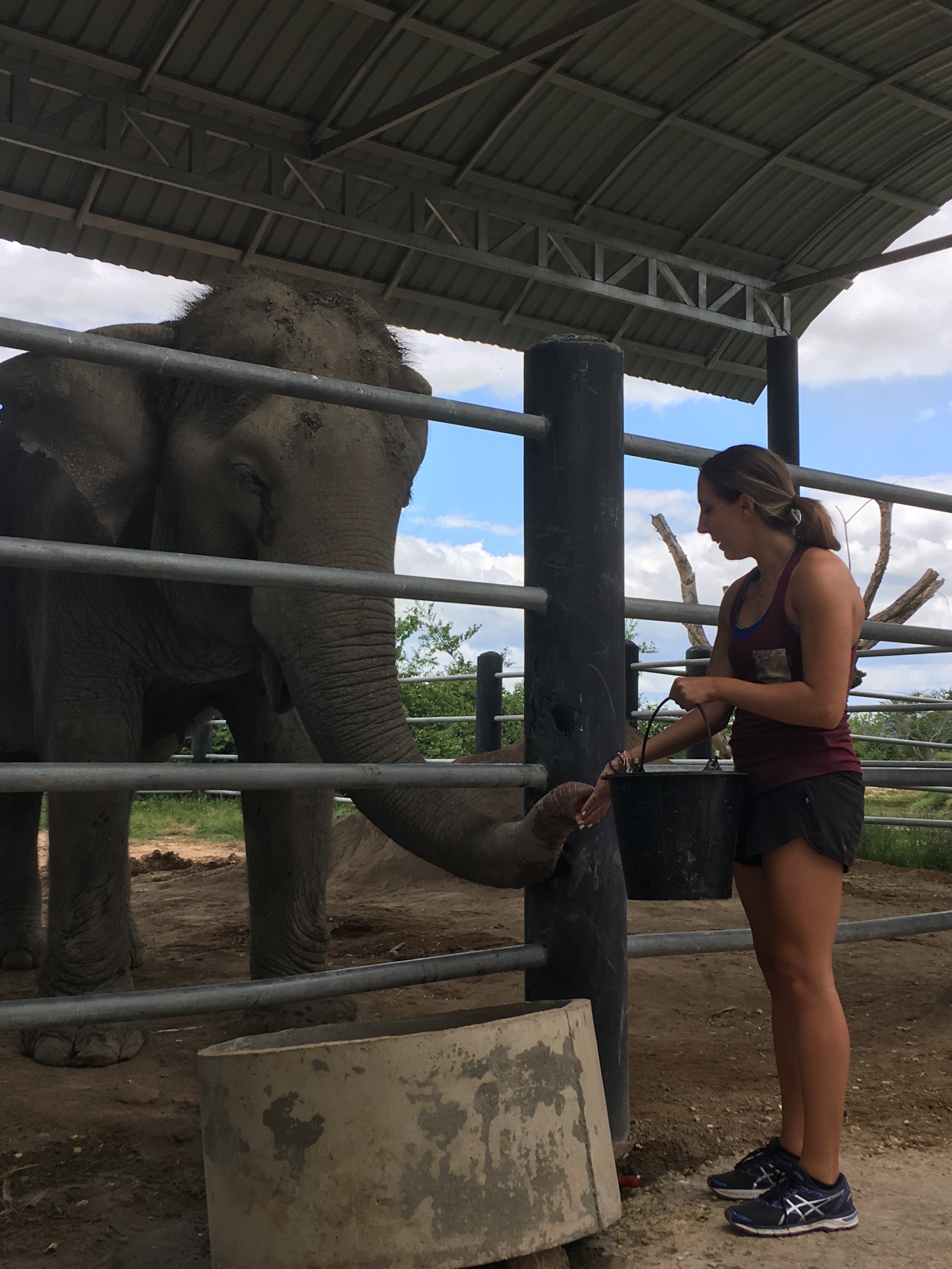 Following our arts and crafts experiment, it was time to get our swimsuits on to bathe the elephants. I recently learned that bathing with elephants can cause them a lot of stress since being around humans while trying to bathe is obviously not natural for them. Due to the stress, ENP has cut all bathing sessions from their visits in an attempt to move toward a more natural environment for their elephants. Hopefully, the Elephant Jungle Sanctuary will eventually move toward this practice as well.