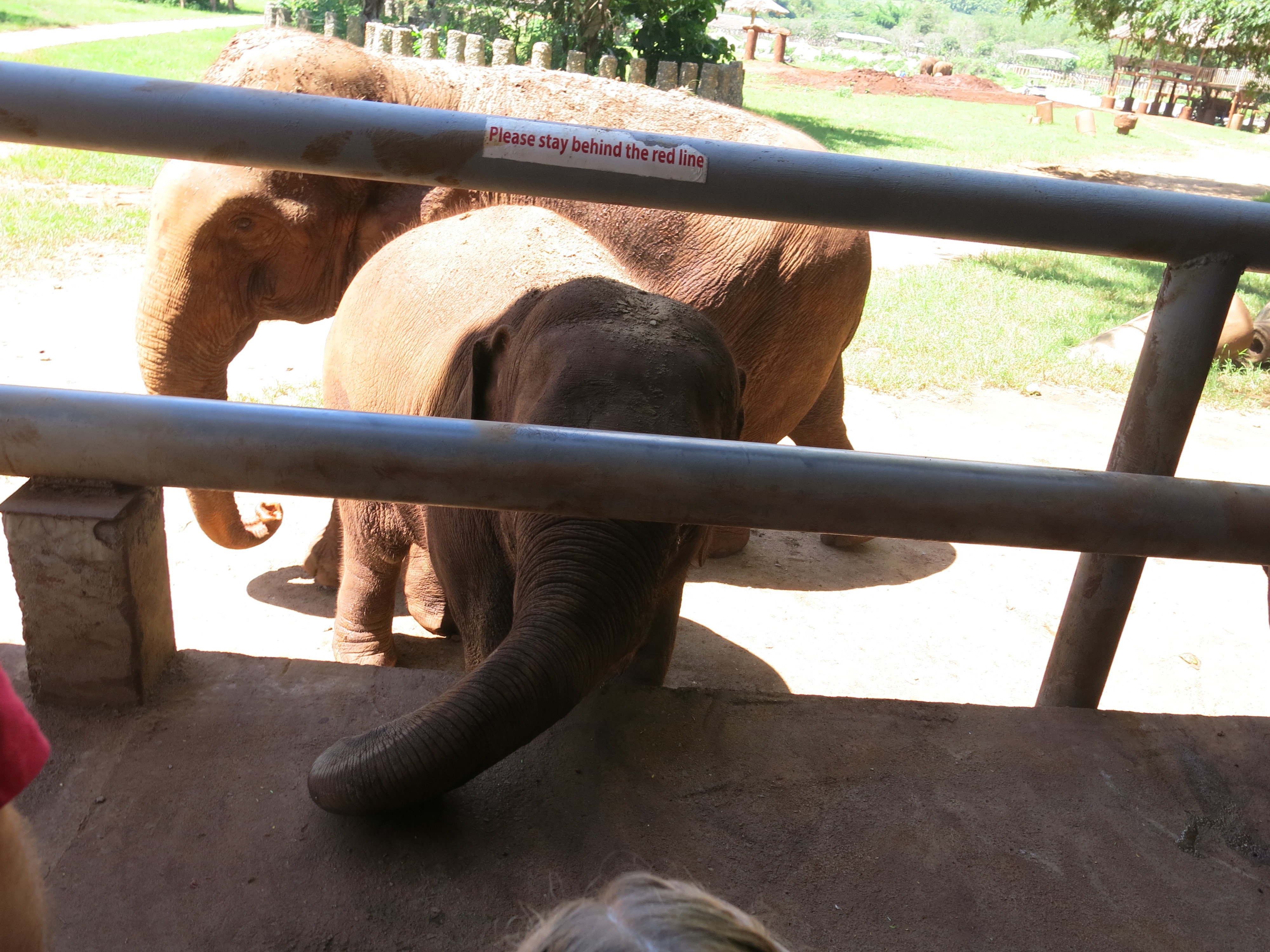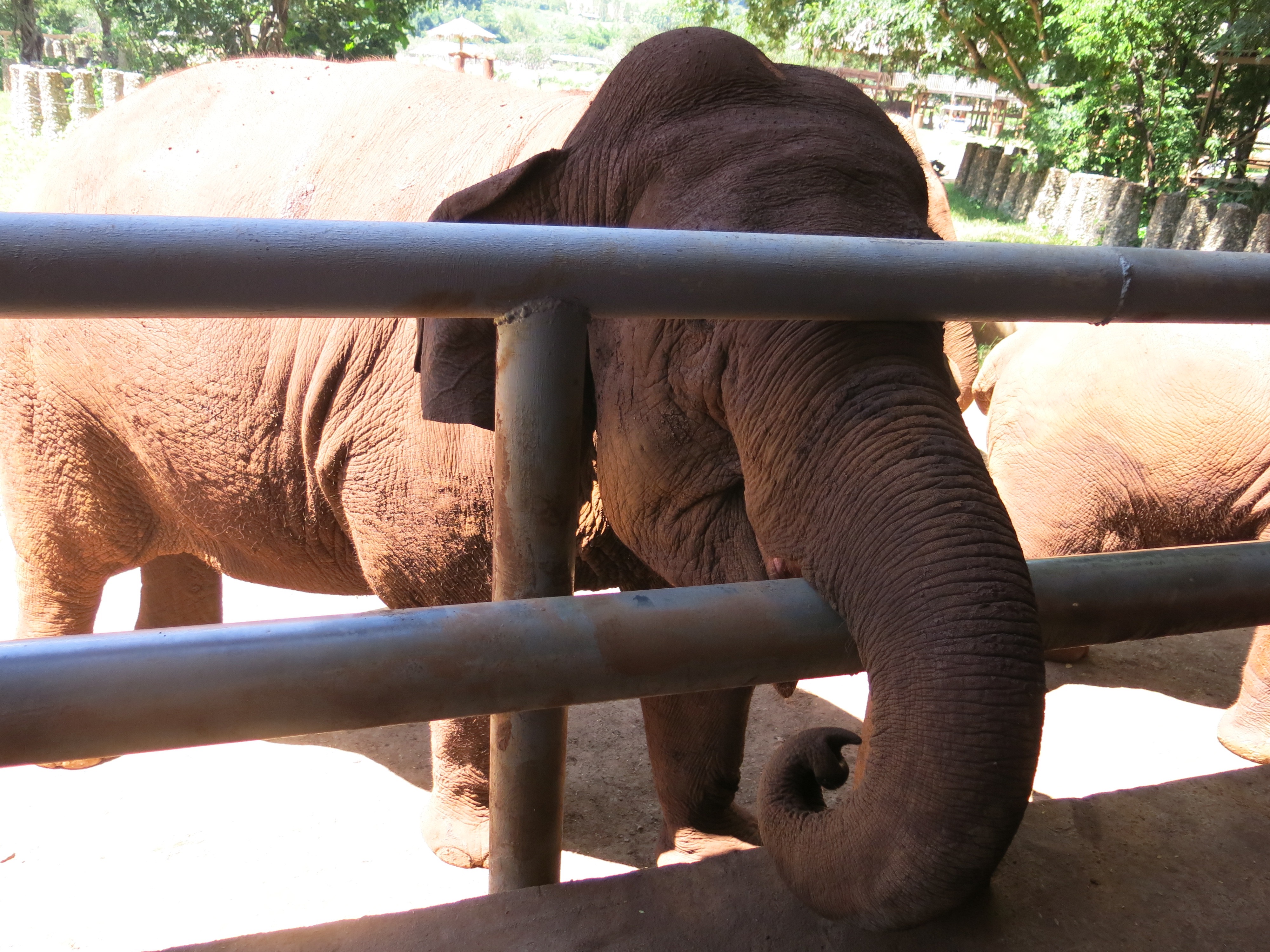 Almost all of the elephants at the park are older retired elephants that have been rescued from their previous lives to live the remainder of their days in peace. There is a noticeable absence of baby elephants at the park. The park focuses on rescuing older elephants rather than breeding more elephants. Although we met two younger elephants that had been born at the park, the majority of them are in their 50s, 60s, and 70s–their oldest elephant is over 100 years old! Below are two young elephants we were excited to see on our tour: