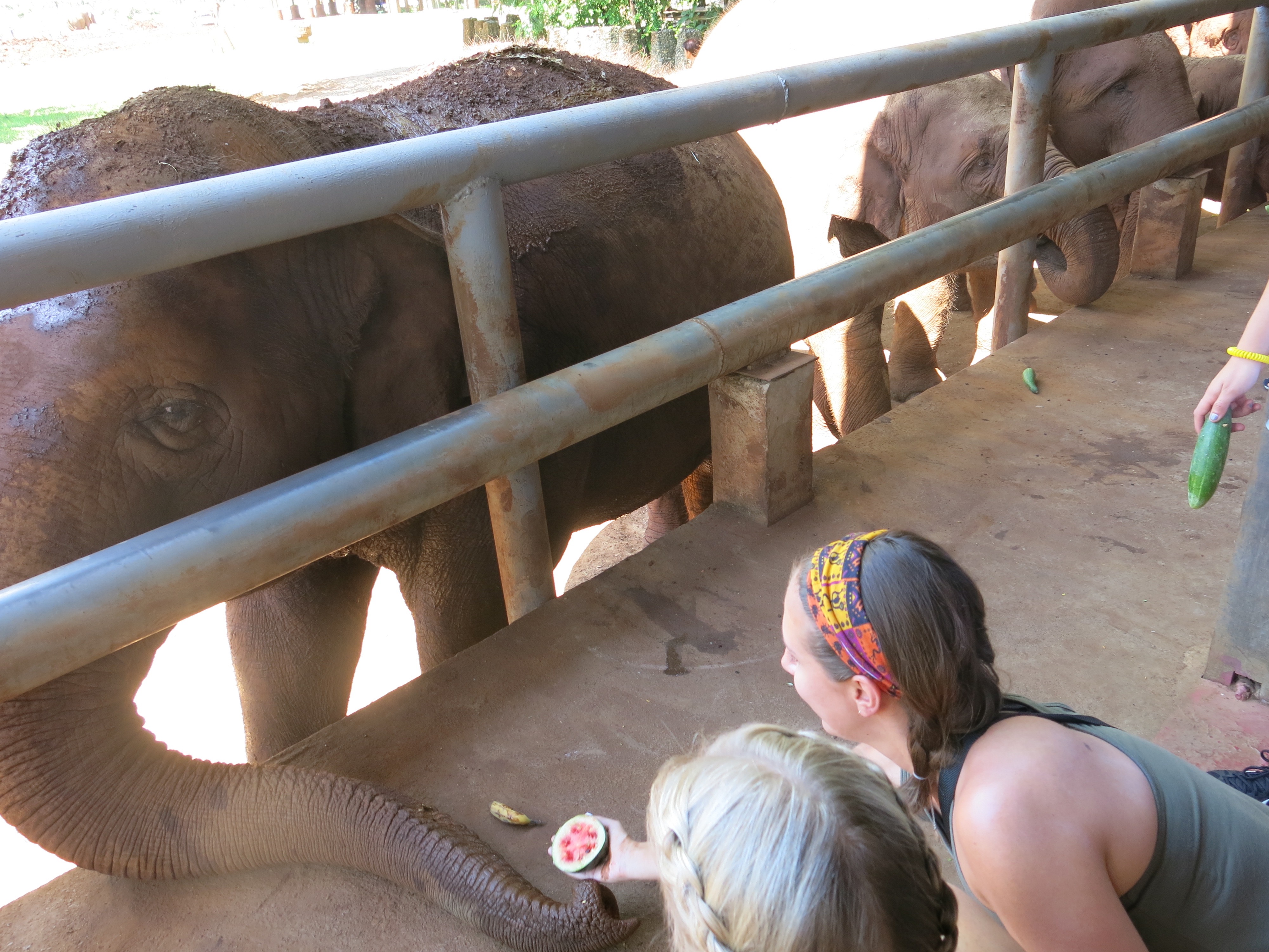 We awoke in the morning to the sight of an elephant playing happily with a tire in our backyard. We dressed quickly and joined the others in our group for breakfast. We received large cloth bags and were instructed to fill those bags with as many bananas and pieces of watermelon as we could carry comfortably for a 20 minute walk. Our guide took us to ENP’s brand new enclosure where they were building a wrap around terrace for visitors to see the elephants interact with each other more clearly. A herd of sweet female elephants joined us for part one of their breakfast.