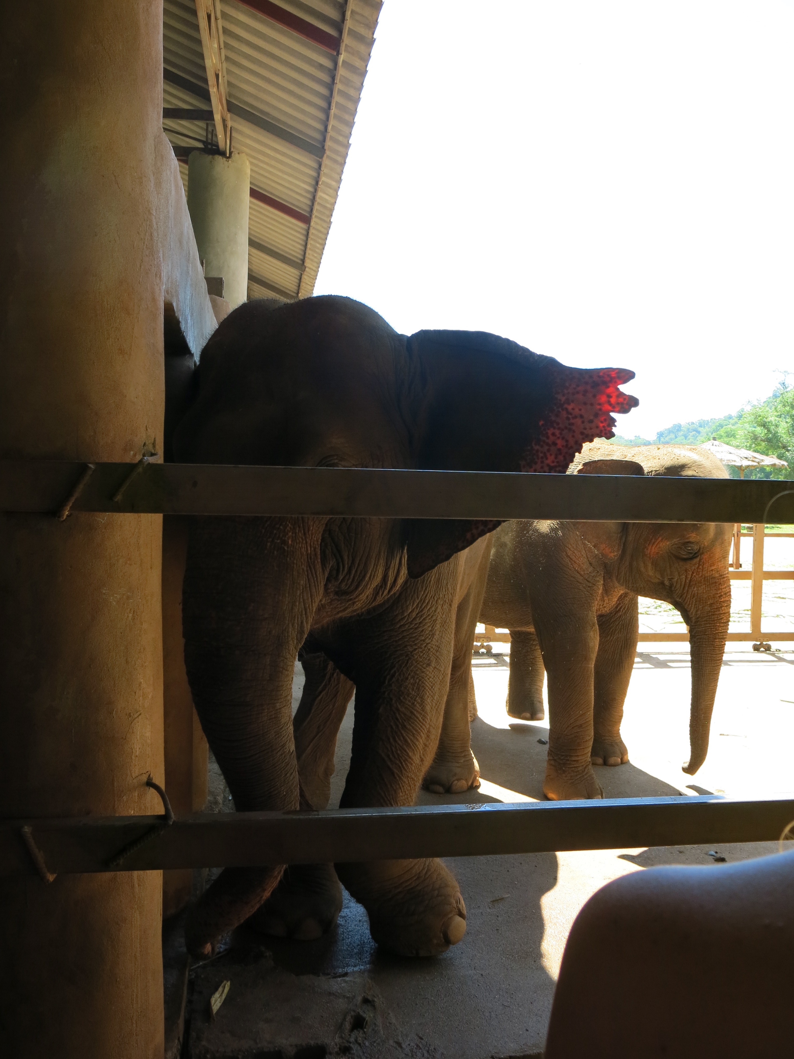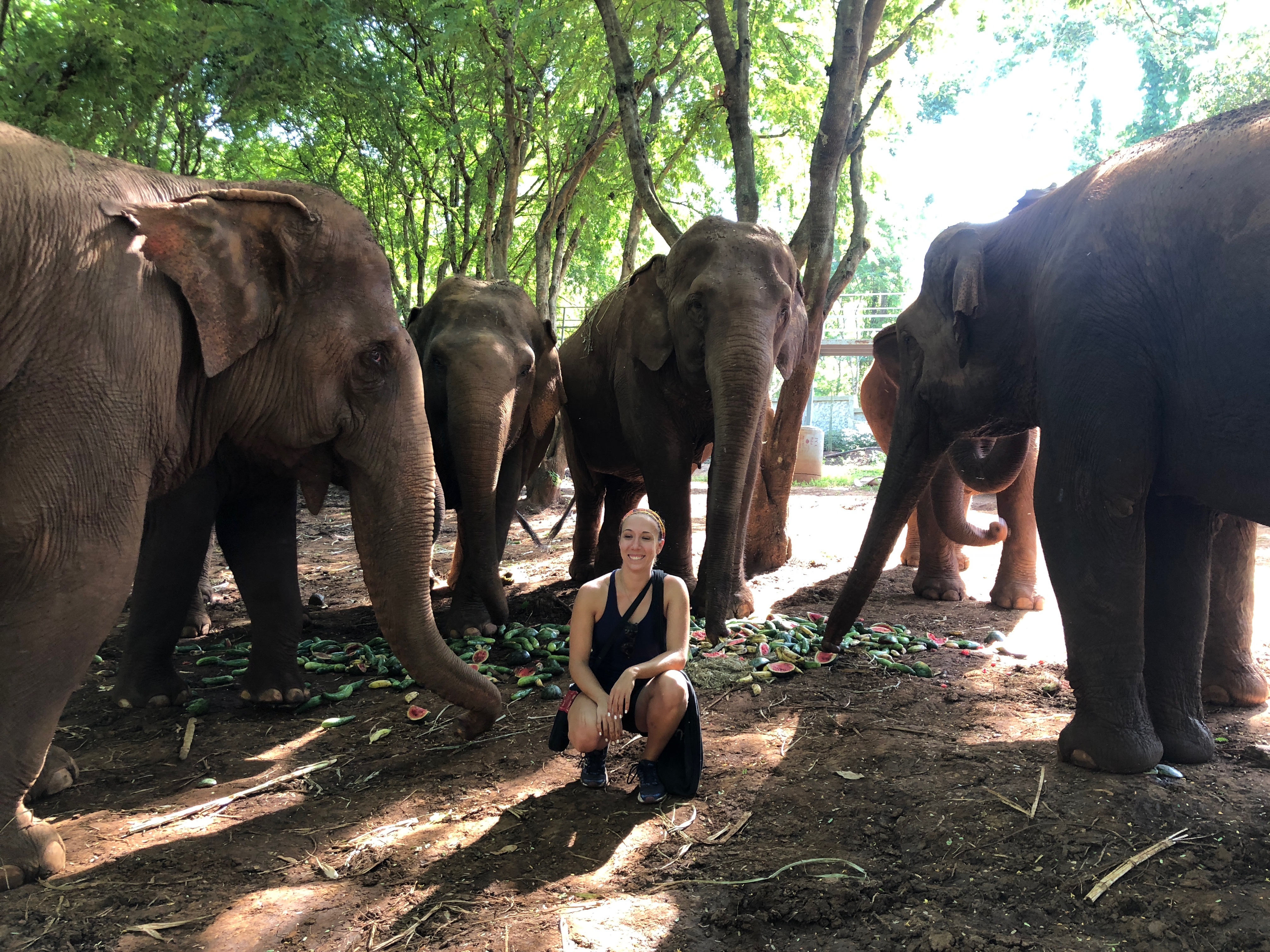 The first excursion (and the one I was most excited to take part in) was my overnight stay at the Elephant Nature Park (ENP). The day started at their offices in the center of Chiang Mai proper where they picked me and my friend, Lindsey, up to make the hour drive to the park. On the way, we watched a documentary that detailed when and how we were allowed to interact with the elephants (i.e.: never walking behind the elephants, only touching them on the neck behind their ears, and only touching their trunks during feeding time). The documentary also detailed the founding of ENP by Lek Chailert in the 1990s and her mission to rescue older elephants from the trekking and tourism industries throughout Thailand. The grounds of ENP are nothing short of extraordinary. in a large valley surrounded by dense greenery, elephants are free to roam with their mahouts (caretakers) close by. While mahouts in the tourism and trekking industries use fear and intimidation tactics to control their elephants, ENP has spearheaded a new way of working with elephants focused on using positive reinforcement by rewarding the elephants with their favorite snacks…watermelon and bananas!